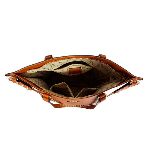 - Tira con Detalles Metálicos: Cadena para llevar en el hombro, con 68 cm de longitud.