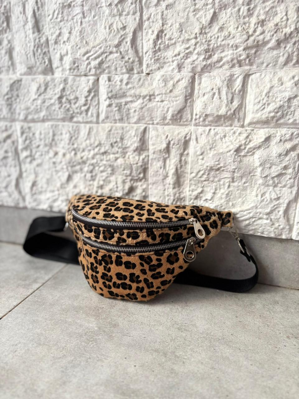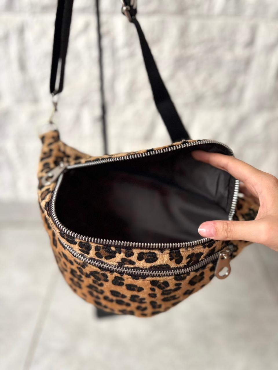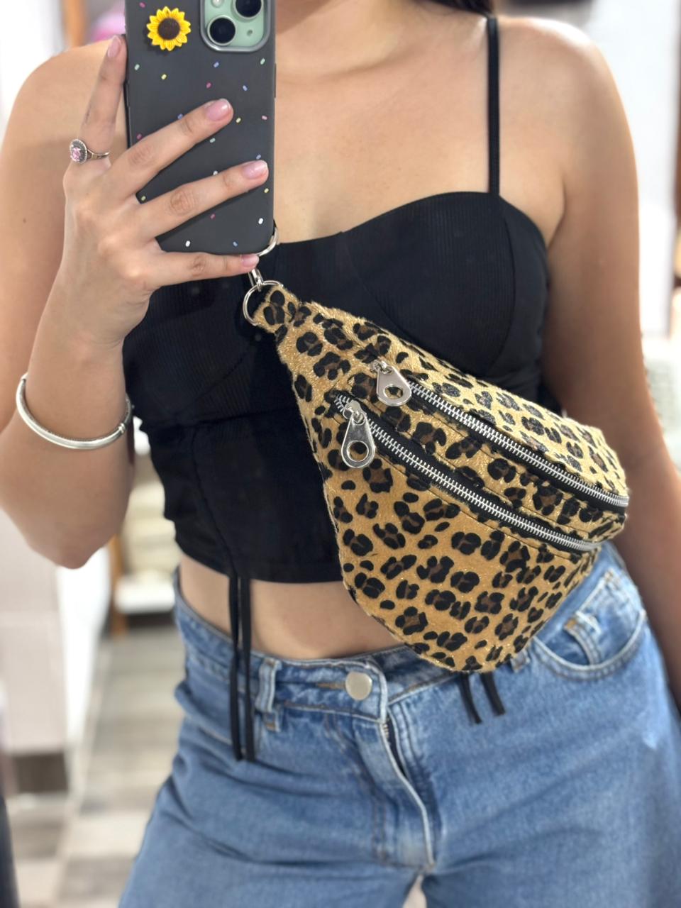 Riñonera confeccionada en material animal print de textura simil piel, suave al tacto y con un brillo sutil que suma carácter sin exagerar.